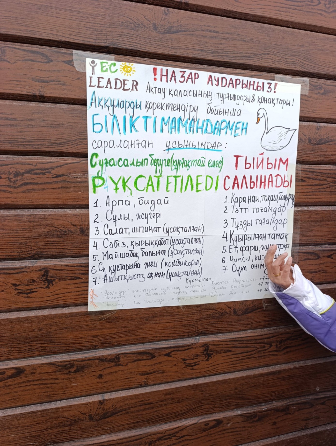 Сонымен қатар еріктілер жағалаудағы аққуларға қандай тағам беруге болмайтыны жөнінде ақпараттық тақтайшалар орнатып, тұрғындарға түсіндіру жұмыстарын жүргізді. Олар құстарға арнайы жем беріліп, табиғатты қорғау мәдениетін насихаттады.