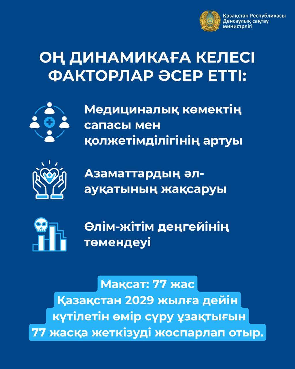 Қазақстан Үкіметі 2029 жылға дейінгі денсаулық сақтауды дамыту тұжырымдамасы шеңберінде елдегі күтілетін өмір сүру ұзақтығын 77 жасқа дейін жеткізу жөнінде өршіл мақсат қойып отыр.