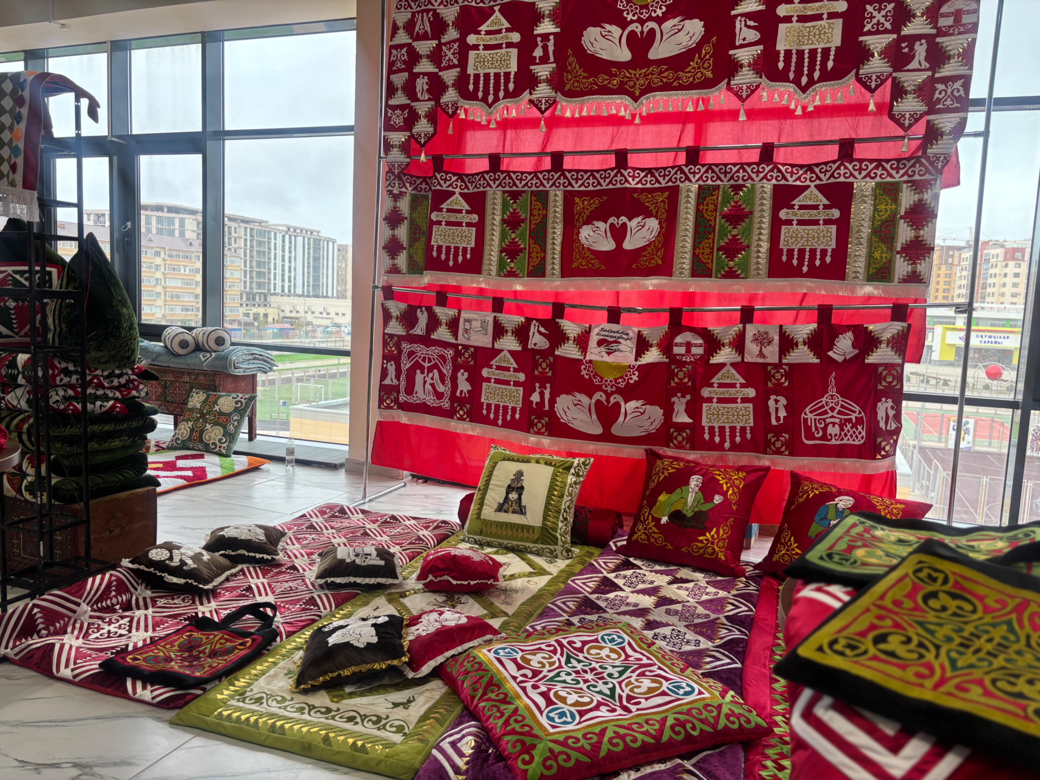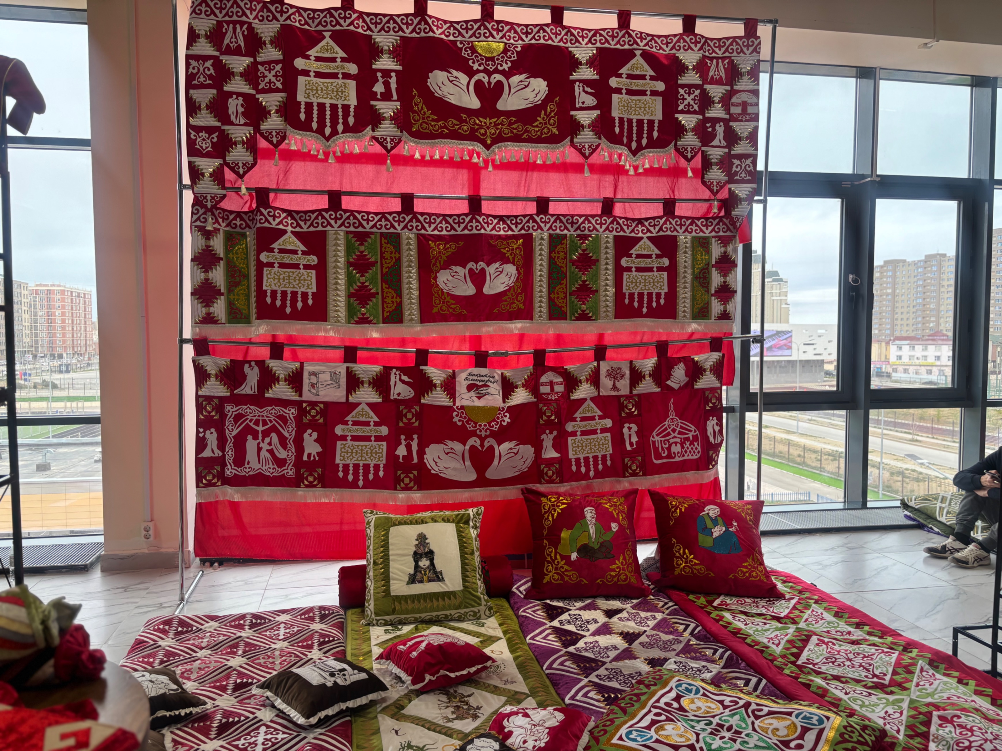 Сондай-ақ тігінші шымылдықағы әр ою мен суреттің мән-мағынасын түсіндірді. Оның айтуынша, жүректі бейнелеген қос аққу – пәк сезім мен адал махаббаттың символы.