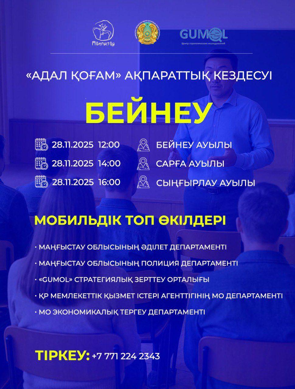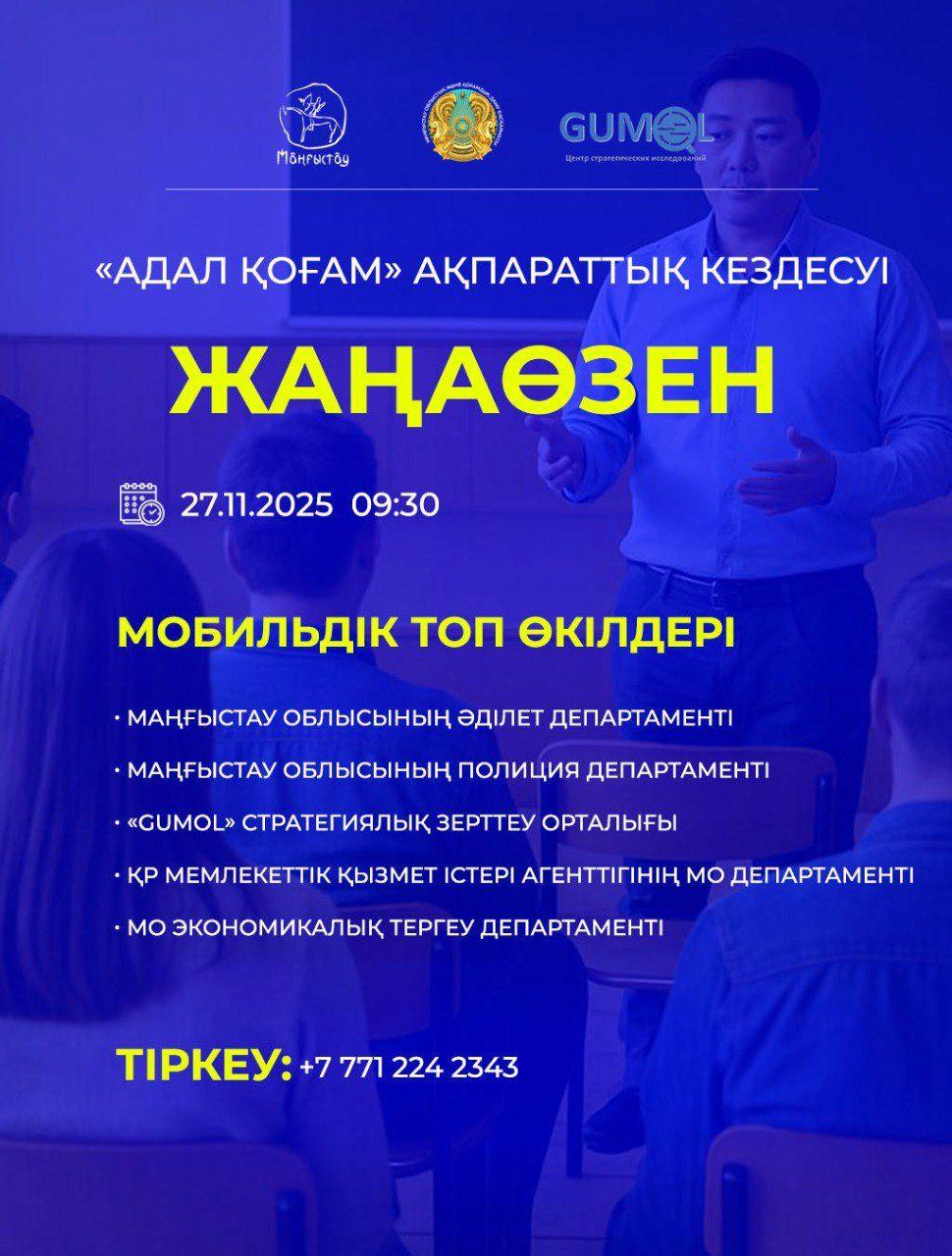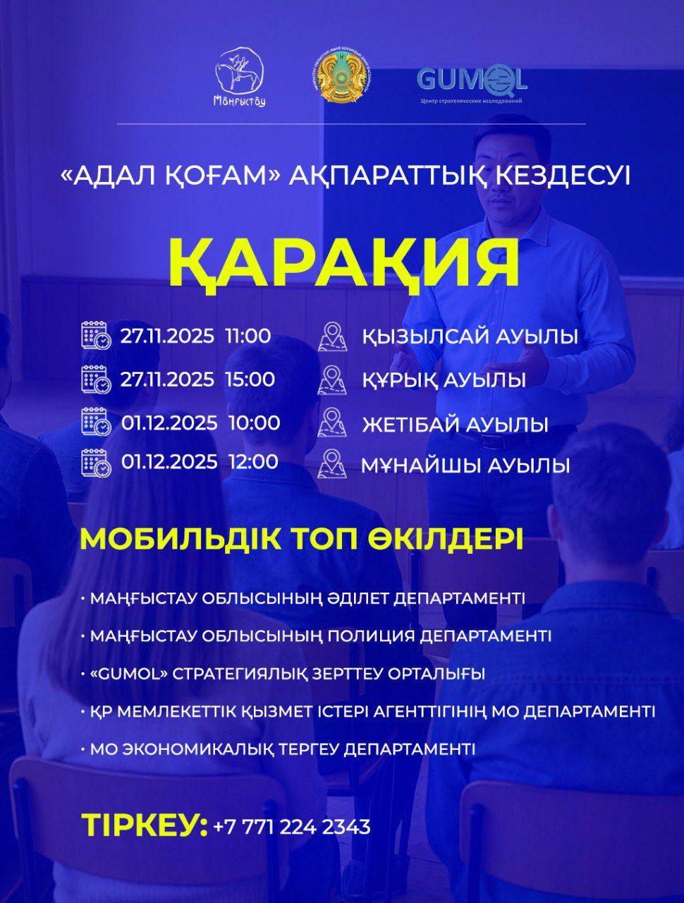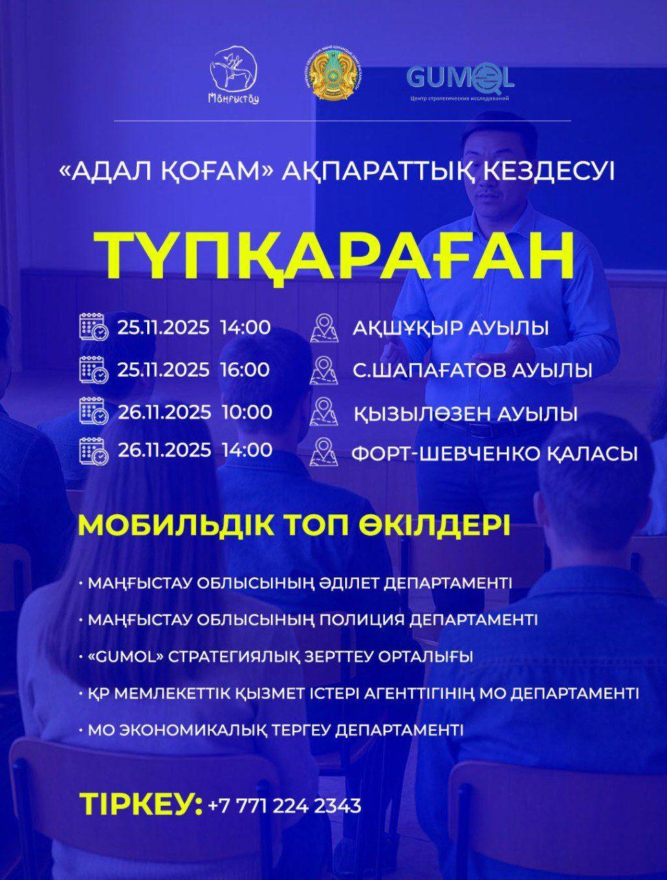 Маңғыстауда облысы бойынша әділет, полиция, мемлекеттік қызмет істері, экономикалық тергеу департаменті мамандарынан құралған арнайы мобильді топтың ақпараттық кездесуі өтеді.