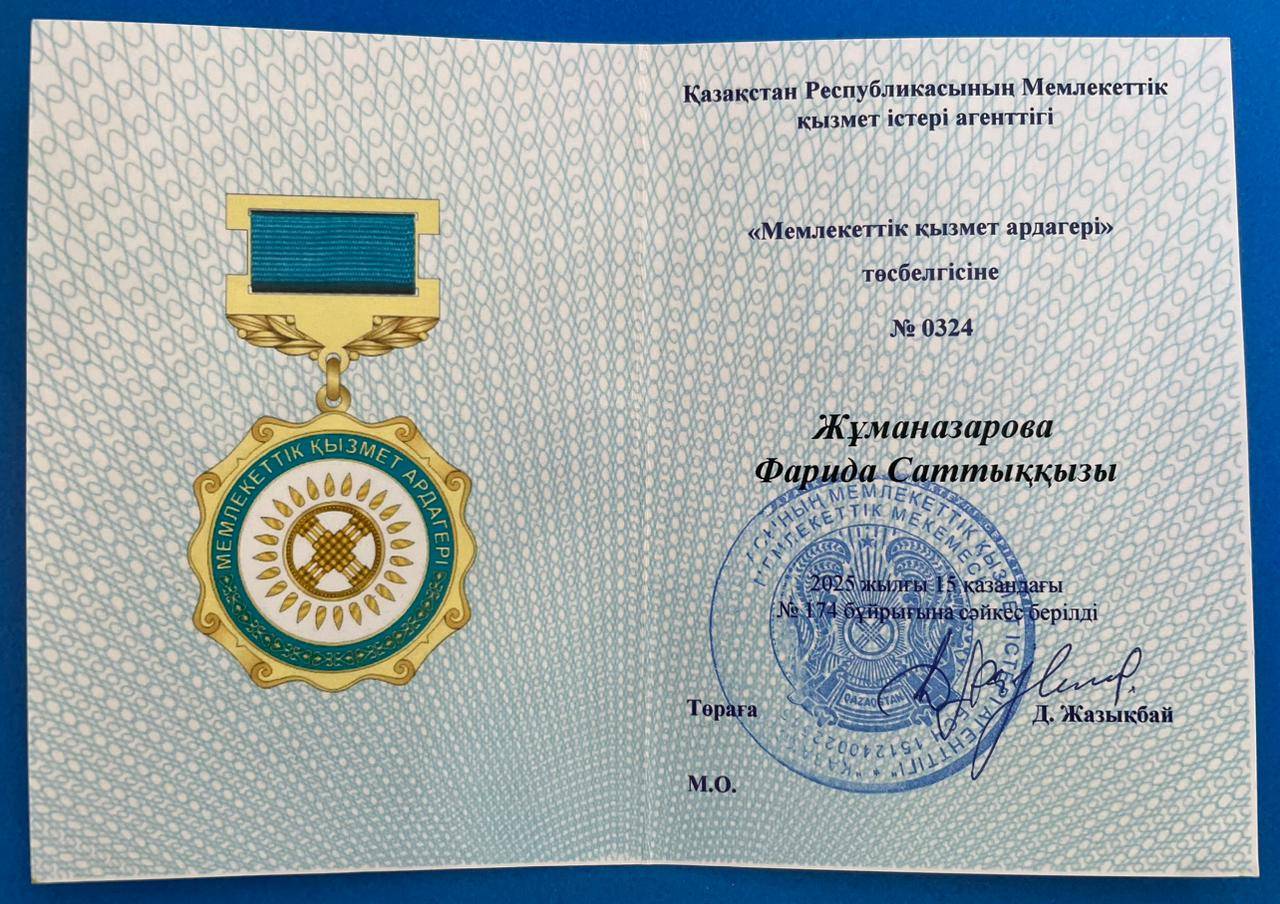 Маңғыстаулық мемлекеттік қызметші «Мемлекеттік қызмет ардагері» төсбелгісімен марапатталды