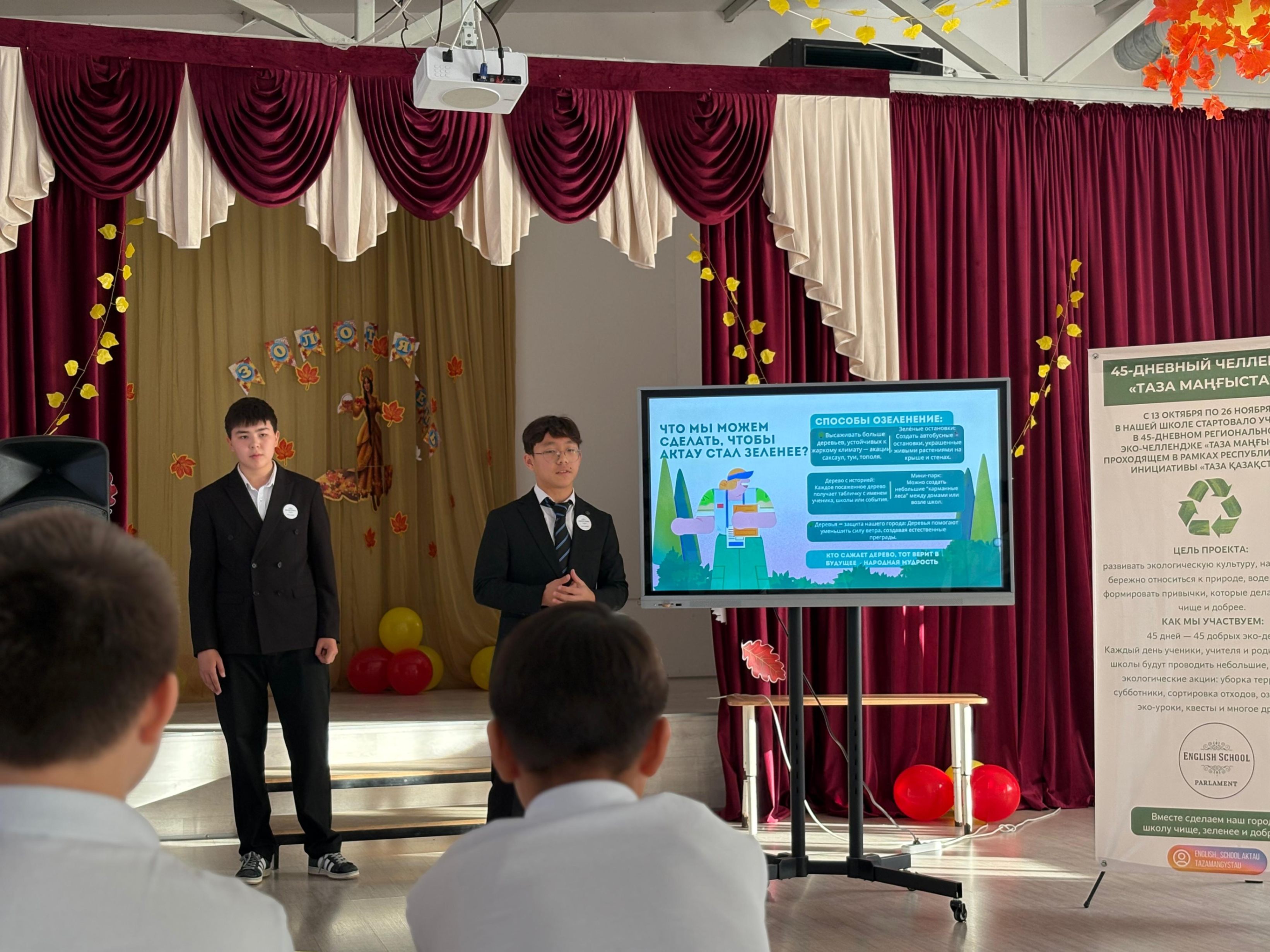 Отметим, что данное учебное заведение является одним из наиболее активных участников экологического челленджа. Здесь с 13 октября по 26 ноября в рамках республиканской акции «Таза Қазақстан» проходит 45-дневная региональная инициатива «Таза Маңғыстау». Каждый день учителя, учащиеся и родители принимают участие в субботниках, а также активно вовлекаются в экологические уроки и квесты. Кроме того, на каждом этаже школы установлены специальные контейнеры для раздельного сбора отходов.