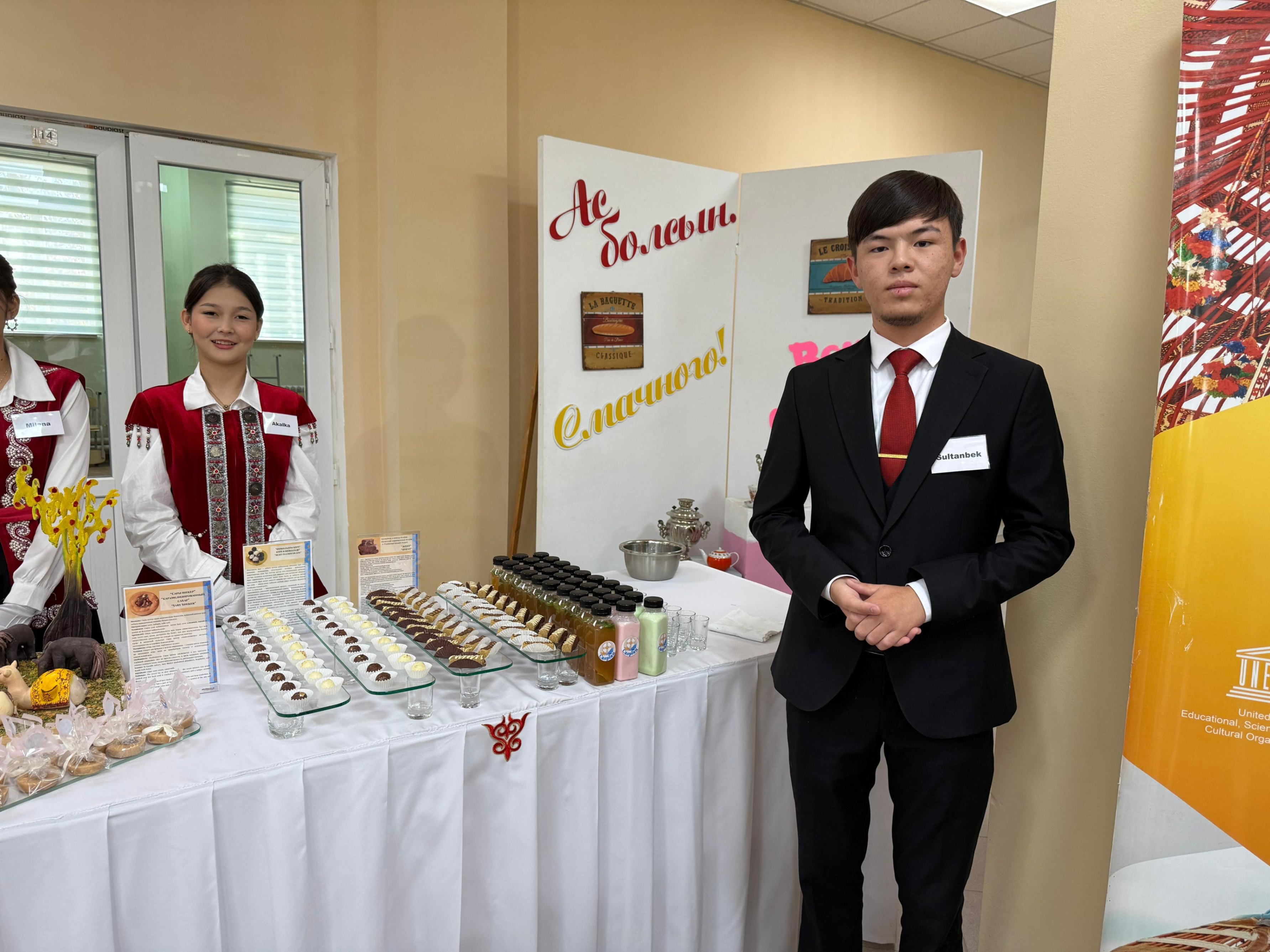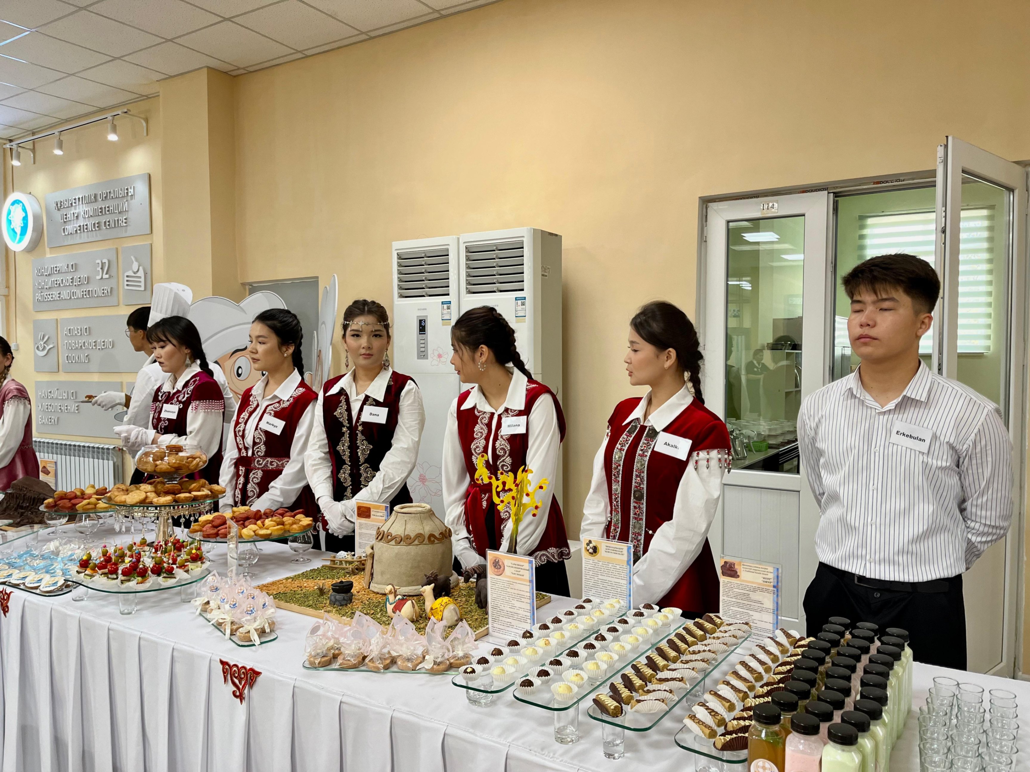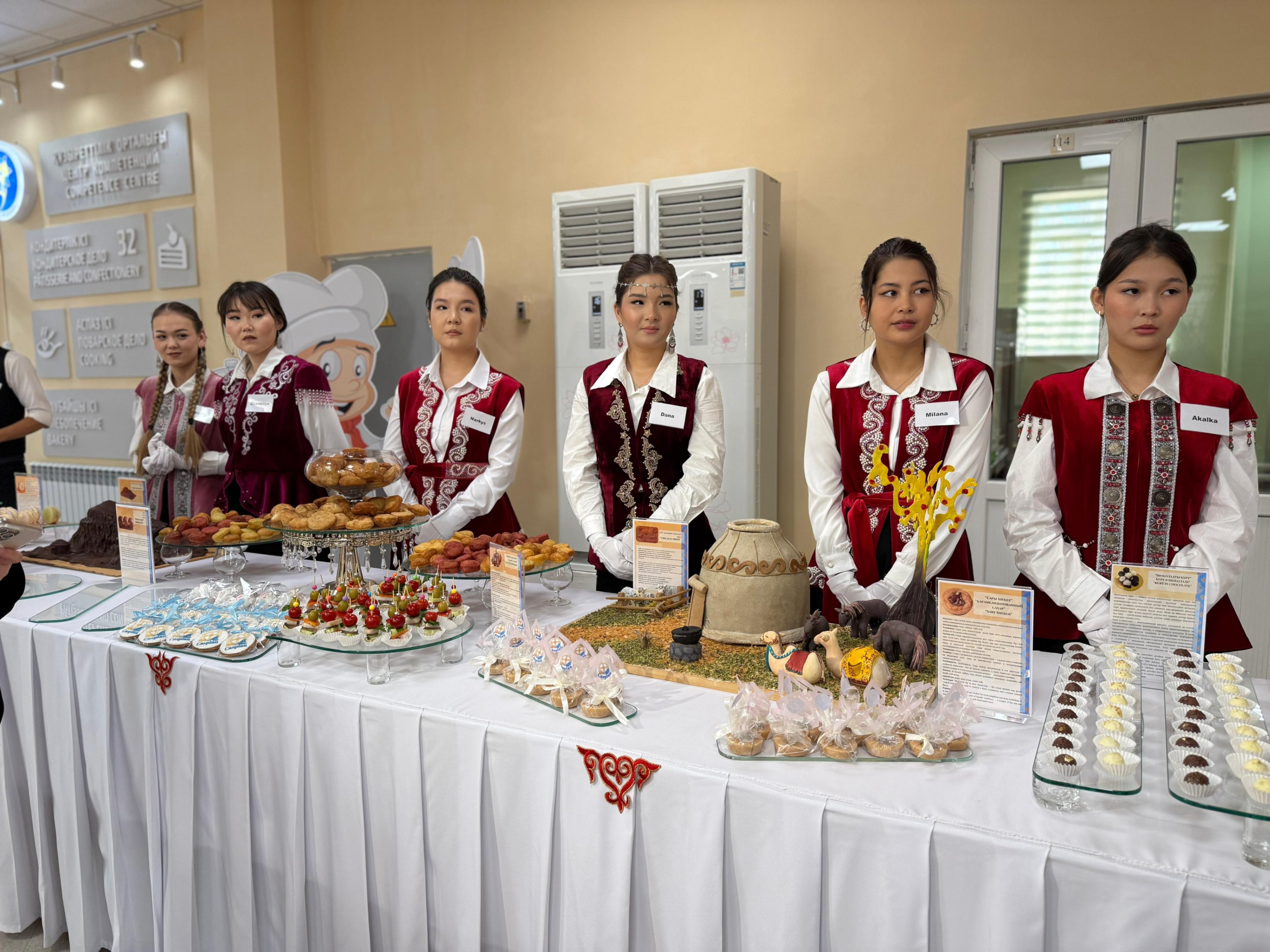 Гости смогли попробовать оригинальные блюда и напитки, среди которых — коктейль из шубата, чай с верблюжьей колючкой, makarons из талкана, шоколад с куртом и жентом, мороженое из иримшика, чизкейк из просо и балкаймака, а также жёлтый сахар, приготовленный из верблюжьего молока.